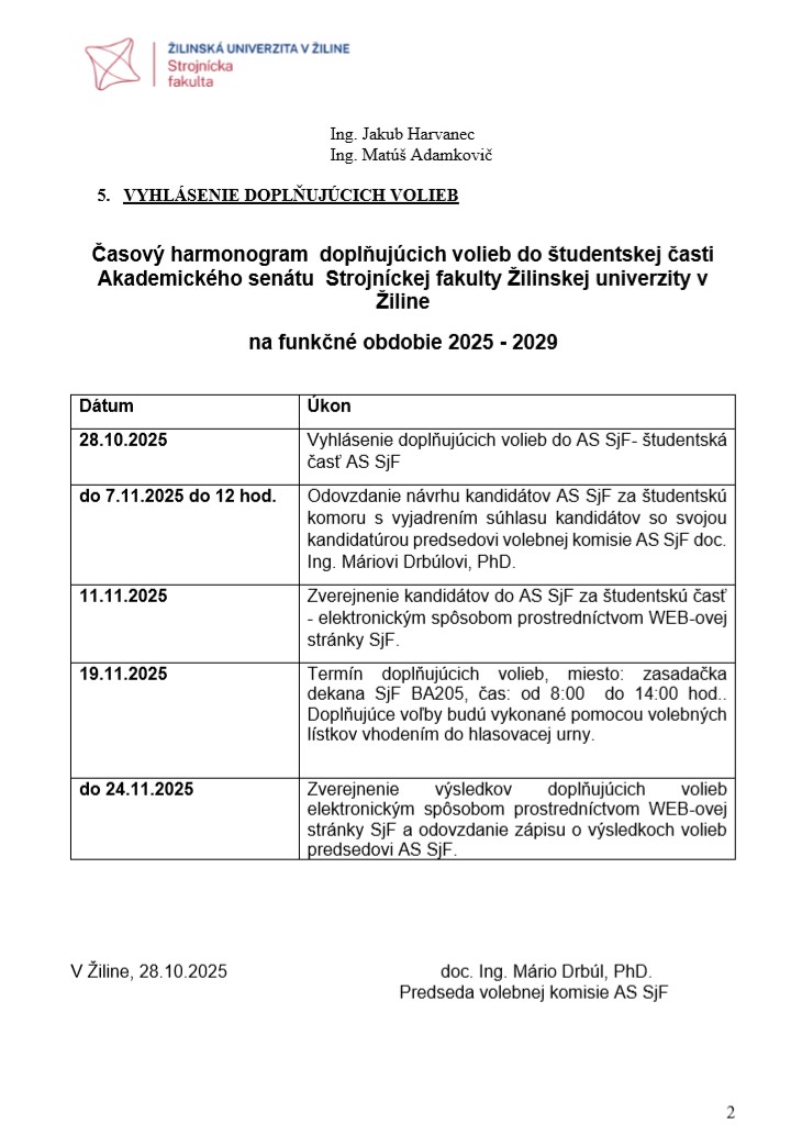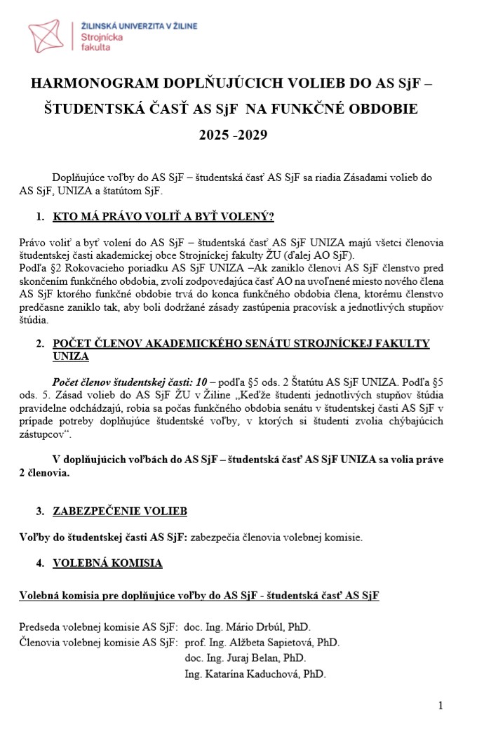 (ďalej len „AS SjF“) na svojom 3. zasadnutí schválil vyhlásenie doplňujúcich volieb do študentskej časti Akademického senátu SjF. Doplňujúce voľby sa uskutočňujú v súlade s § 6 ods. 11 Zásad volieb do AS SjF, a to z dôvodu ukončenia štúdia doterajších študentských zástupcov v senáte. Návrhy kandidátov na zástupcov študentskej časti akademickej obce fakulty sa podávajú elektronicky alebo listinne. Každý navrhnutý kandidát je povinný doručiť písomné vyjadrenie súhlasu s nomináciou na predpísanom tlačive (uvedenom v prílohe tohto oznámenia) členom volebnej komisie najneskôr do 7. 11. 2025 do 12:00 hod.