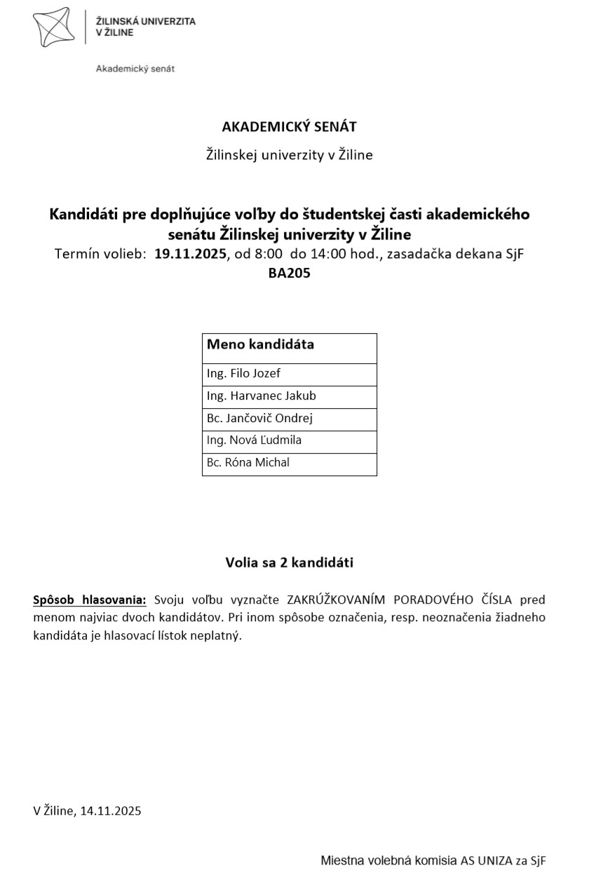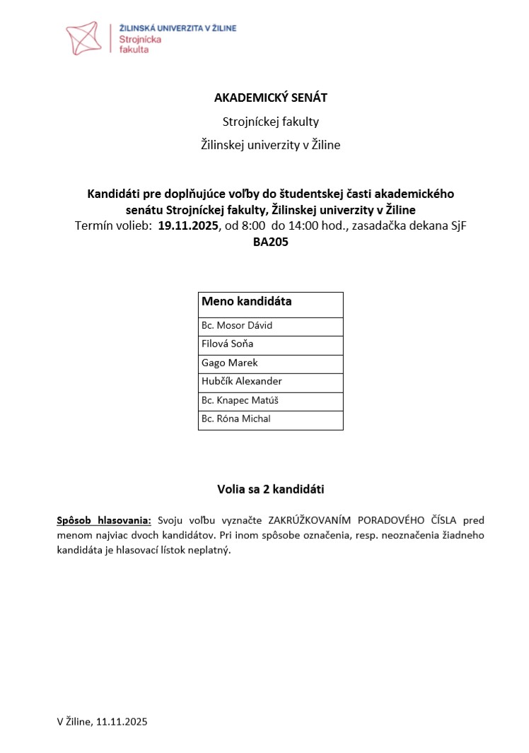 v súlade s vnútorným predpisom Žilinskej univerzity v Žiline – Smernica č. 241 – Zásady volieb do Akademického senátu UNIZA, sa uskutočnia doplňujúce voľby dvoch členov študentskej časti Akademického senátu Žilinskej univerzity v Žiline za Strojnícku fakultu.