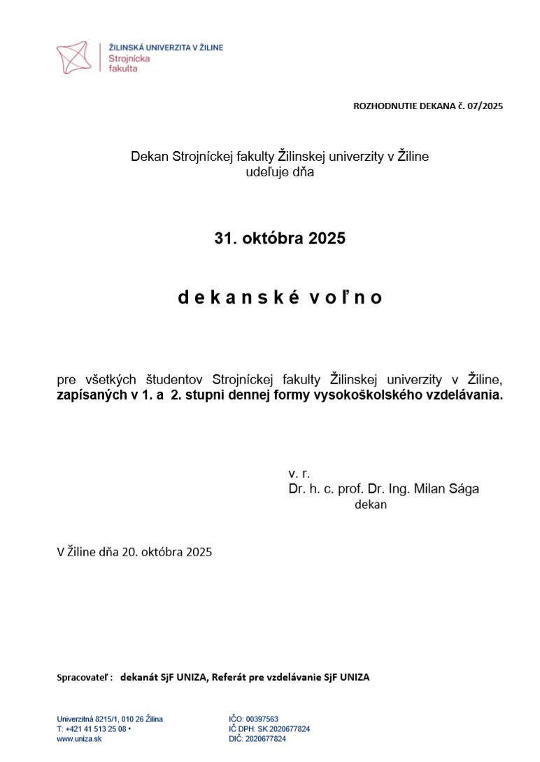 Admnistrator 20 October 2025 Hits: 401 ROZHODNUTIE DEKANA č. 7/2025 Previous article: Pozrite si momenty zo slávnostnej imatrikulácie študentov našej fakulty Prev Next article: Prospechové štipendiá_predbežný zoznam oprávnených Next
